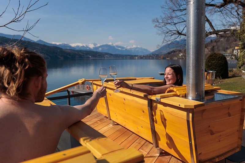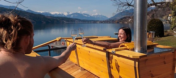 Am Ufer des Millstätter Sees, direkt an der Villa Postillion in Millstatt am See, verbindet das SeeBad Wärme und Weite zu einem stillen Luxusmoment. Zwei holzbeheizte Outdoor-Badewannen stehen auf einem privaten Deck mit direkter Seeberührung, gefüllt mit rund 40 °C warmem Quellwasser.