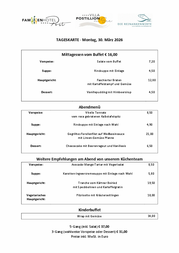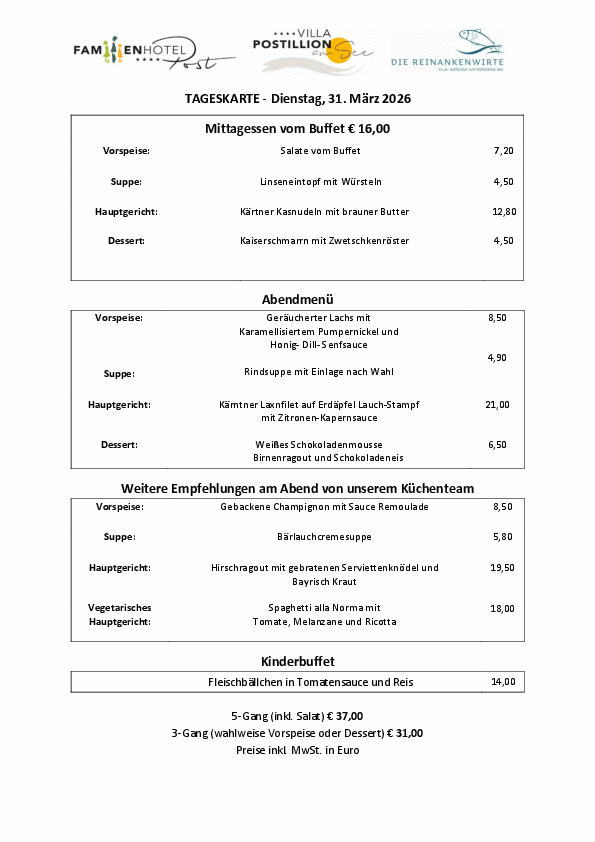 Täglich verwöhnen wir unsere Gäste mit einem vielfältigen Abendmenü bzw. eigenem Kinderbuffet. Hier sehen Sie unser Auswahl für heute, morgen und übermorgen. Guten Appetit!